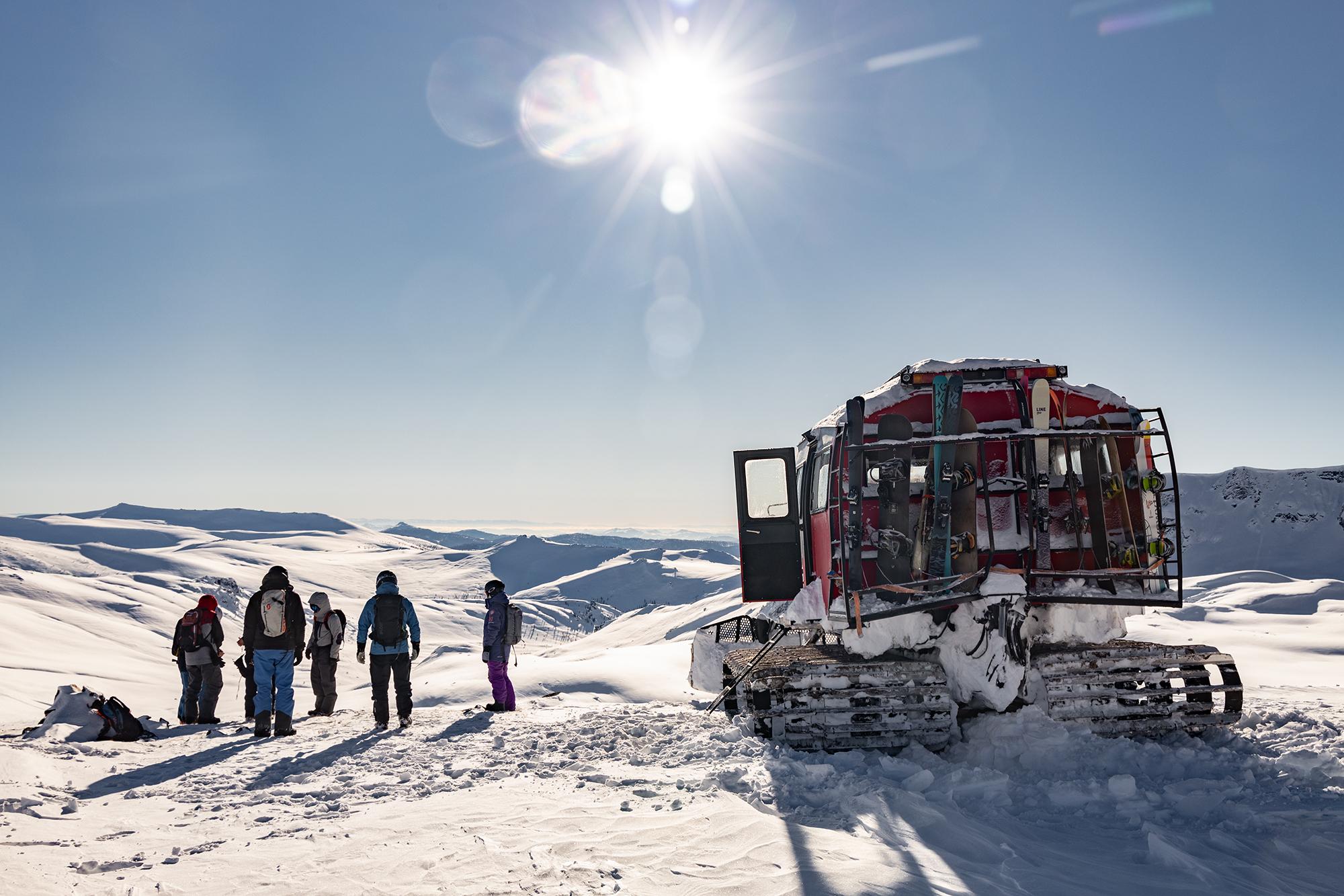 Вместо вертолётов — ратраки с теплыми пассажирскими кабинами. Этот формат катания (catski) стал хитом среди гостей: и главное — никакой зависимости от погоды и значительно дешевле хелиски. Конечно же профессиональные гиды и безопасные маршруты — база, на которой основываются фрирайд туры.